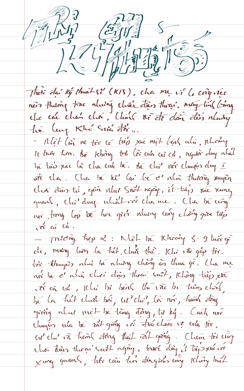 – Trường hợp khác: Một bé khoảng 8-9t miệng luôn la hét, chửi thề. Khi vào gặp tôi, tôi khuyên nhủ bé nhưng chẳng ăn thua gì. Cha mẹ nói bé ở nhà chơi điện thoại suốt, không tiếp xúc với ai cả. Khi bị bệnh thì vào bệnh viện tiêm chích, bé la hét chửi bới, cử chỉ, lời nói, hành động giống như một bé tăng động, tự kỷ. Cách nói chuyện, cử chỉ, hành động của bé rất giống với đứa cháu của tôi, kể cả việc hỏi những câu hỏi đơn giản cũng không trả lời được. Bé chậm hơn so với cùng lứa, may mắn cháu tôi nhờ đi học nhiều lĩnh vực, kiểm soát việc dùng điện thoại và cho tiếp xúc nhiều với xung quanh nên bé phát triển trở lại bình thường…